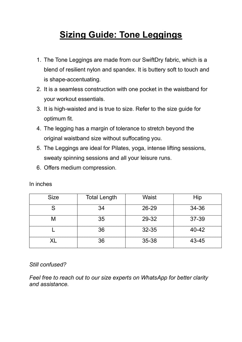 Our Tone Leggings is where luxury meet performance, constructed from innovative SwiftDry that feels seriously soft against skin. It has NO FRONT SEAM so say goodbye to camel toes fear forever. The fabric moves seamlessly with your body . Built to sculpt and define your natural contours, the ankle length cut ensures no bunching at the ankle. Whether you're training or moving through your day, these leggings deliver the softness of a cloud with the technical performance serious athletes demand.